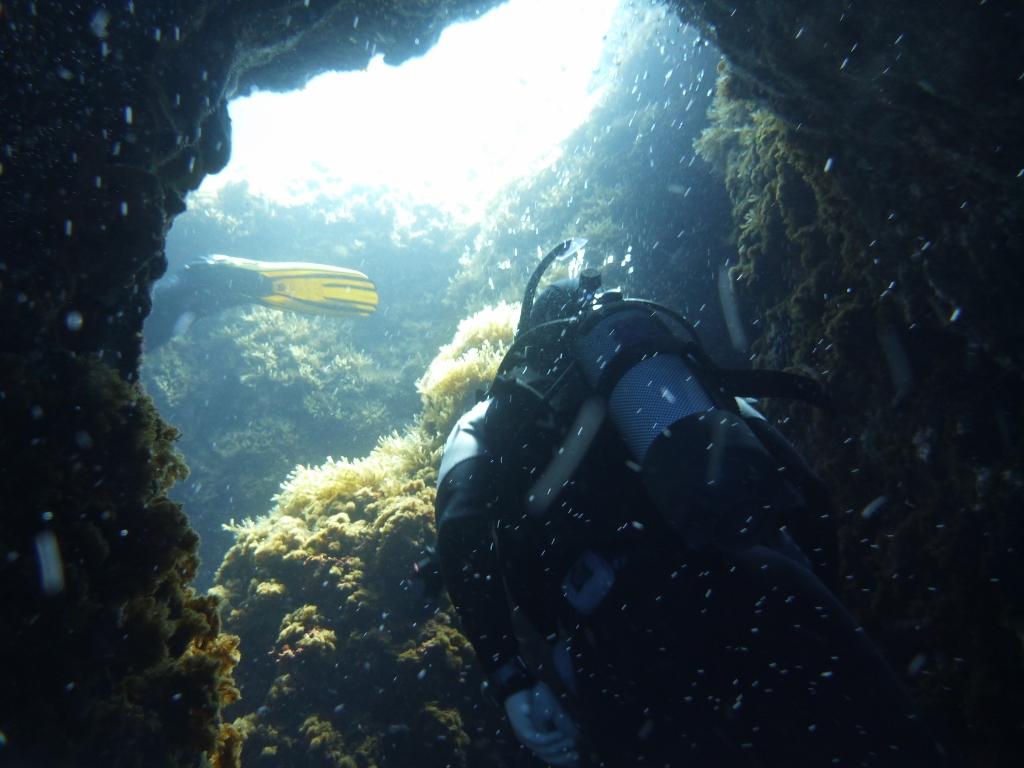 We had lunch at a dodgy kebab van on Camino of burger and fries (recommended to the least dodgy of two vans) before heading to the Camino Caves. Having discussed the issue with the Cresta professionals over my burger, I switched buddy and descended alone with the dive instructor. He was very considerate and took me through a number of gentle swim-throughs, eventually getting to around 11 metres with only a little delay due to my ears. Although it is important not to risk diving in these situations, it is also useful to learn what is actually a problem and what may just be a little hypochondriacal man-flu…