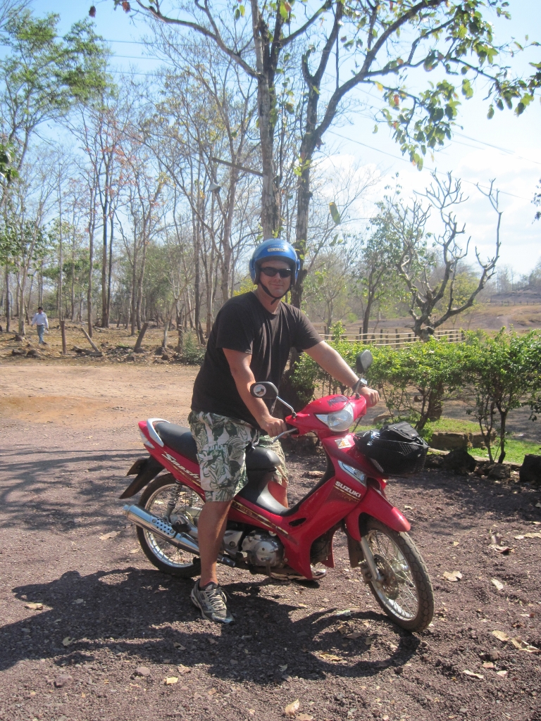 Having arrived in Pakse at mid-afternoon, we wanted some basic, budget accommodation. The Lankham hotel, doubling up as a motorbike rental, certainly served up basic, small, budget accommodation and so, after being offered some even smellier rooms at different locations for twice the price, we checked in there for around 90,000 kip (circa $11-12) and agreed to hire a 110 cc semi-automatic Suzuki motorbike for two days to take our own tour around the nearby waterfalls and Bolaven plateau (the coffee growing district of Laos) for 70,000 kip per day (including helmets, although make sure that the visor is actually see-through and not scratched to hell…). I have only driven a moped a couple of times before on small islands and can’t really tell the principle difference between them and motorbikes (something to do with Mods and Rockers my Dad may say?), but thebikes seemed well maintained (the odometer, lights and gears seemed to work, although the tread may not have passed UK standards).
