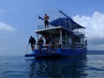 Scuba Nation boast the only purpose built live aboard dive boat in Cambodia. It actually works pretty well, converting a second deck sun lounger into a fully enclosed area complete with camp-beds. As the only couple staying over Anna and I even had a double bed. It was really the best view we have had of any room on our trip, as the covers were curled back in the morning we gazed across the blue waters and to the nearby islands. I wouldn’t want to spend too many nights on there but it was a good communal spirit.
