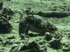 However, there were (literally) millions of them!  We descended through a massive cloud of jellyfish.  They were tiny, about 5-10mm in size, but perfectly formed and closely packed.  I descended more quickly than usual to get through them, noting that Anna was also coming down more quickly than she usually did, and almost missed the mating cuttlefish on the bottom.  Fortunately, at about 14m the jellyfish cloud was above us but we kept swimming through patches.  Wearing goggles and a wetsuit provides a strange feeling of detachment from the world around you, combined with the silence and regular Darth Vader sound of the regulator it often feels like watching a relaxing episode of television.  As we swam towards the Shark “haunt” through a thick mist of jellyfish I felt rather like this, noting with a certain detachment that Anna was holding her hand over her face.  With a sudden jerk I felt a sharp pinprick on my lips from a sting that shook me from my reverie and back into the present – all of my skin was tingling from their passage but this was my first sting and made me realise that this was not the most comfortable dive I had done for a while.