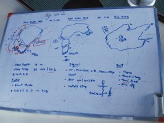 After a really pleasant breakfast and introductory chat with our dive group (the girlfriend of the Swedish guy was doing her Open Water on the boat), Klai came along to give us a briefing.  Now, I was unfairly a little concerned about this, because Anna is not very good at accents, and Klai had a strong Thai accent and that tendency of the Thais to giggle occasionally at strange point in a sentence.  However, Klai’s dive briefing was by far the most professional briefing I have ever had, including on my Open Water and Advanced dives.  He went through a thorough routine of what we should do for a buddy check, safe descent, signals, when he would check for air, how we should ascend, then showed us a map of his planned dive together with what he hoped to see in each place and the options for what we may do.  I later took a photo of his whiteboard which is attached.  The basic plan of the dive was that there was known to be a black-tip reef shark that had a basic swim pattern.  We would follow this in the hope of seeing him.  I can’t stress how impressed I was with Klai’s dive briefing and think it is the perfect standard that would put any diver, from nervous novice to experienced repeat diver at their ease!  My only criticism of the dive briefing  was that Klai pretty much gave me an expectation of seeing the shark, rather than playing this down and perhaps managing my expectations, but I was pretty excited all the same!