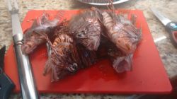 Those who are experienced (like Kent) can fillet the fish without removing the spines. However, the venom remains in the fish for several hours, so clipping away the spines is sensible. The Lionfish are then quite easy to fillet (not that I have filleted any other fish), but getting all the flesh takes some practice.