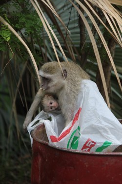 Monkeys and baboons can provide so much entertainment on any safari, they’re so human in many ways.  This monkey mother came a little too close to human, finding a useful resource for feeding her baby in Africa, stacking a useful shopping bag with supplies.