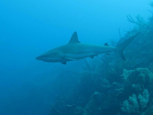 But I do like sharks, and sharks are technically fish (I checked!) – Sharks are a group of fish characterized by a cartilaginous skeleton, five to seven gill slits on the sides of the head, and pectoral fins that are not fused to the head. The Caribbean Reef Shark, or Carcharhinus perezii, is a type of requiem shark, and near threatened on the endangered list. They grow to up to three metres but I have not seen one bigger than about five feet. This fellow grew inquisitive on a dive in the East End – Anna was swimming away and I was swimming in for a close up. Cayman’s East End is a good place to see sharks as they are naturally wary of the busier west side dive sites but have become more inquisitive with the increase of spear fishing to combat the lionfish menace.