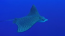 Looking back to check on Dan’s air, I noticed another Eagle Ray gliding along behind him, this time at a depth relative to me that was perfect for a bit of video. Perhaps a little alarmed by our attention, he dove to about 95ft, I eagerly followed with the GoPro, keeping a careful eye on my dive computer, and then swam alongside him for a while, finning hard to keep up with his effortless passage. Eventually, with my watch signalling only 3 minutes of bottom time remaining, the Eagle Ray gave me a last spin and I let him swim off into the distance.